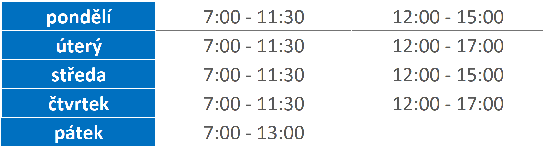 Příjem nových pacientů: PO, ST a Pá 7:00 - 11:00 a ÚT a ČT 13:00 - 16:00